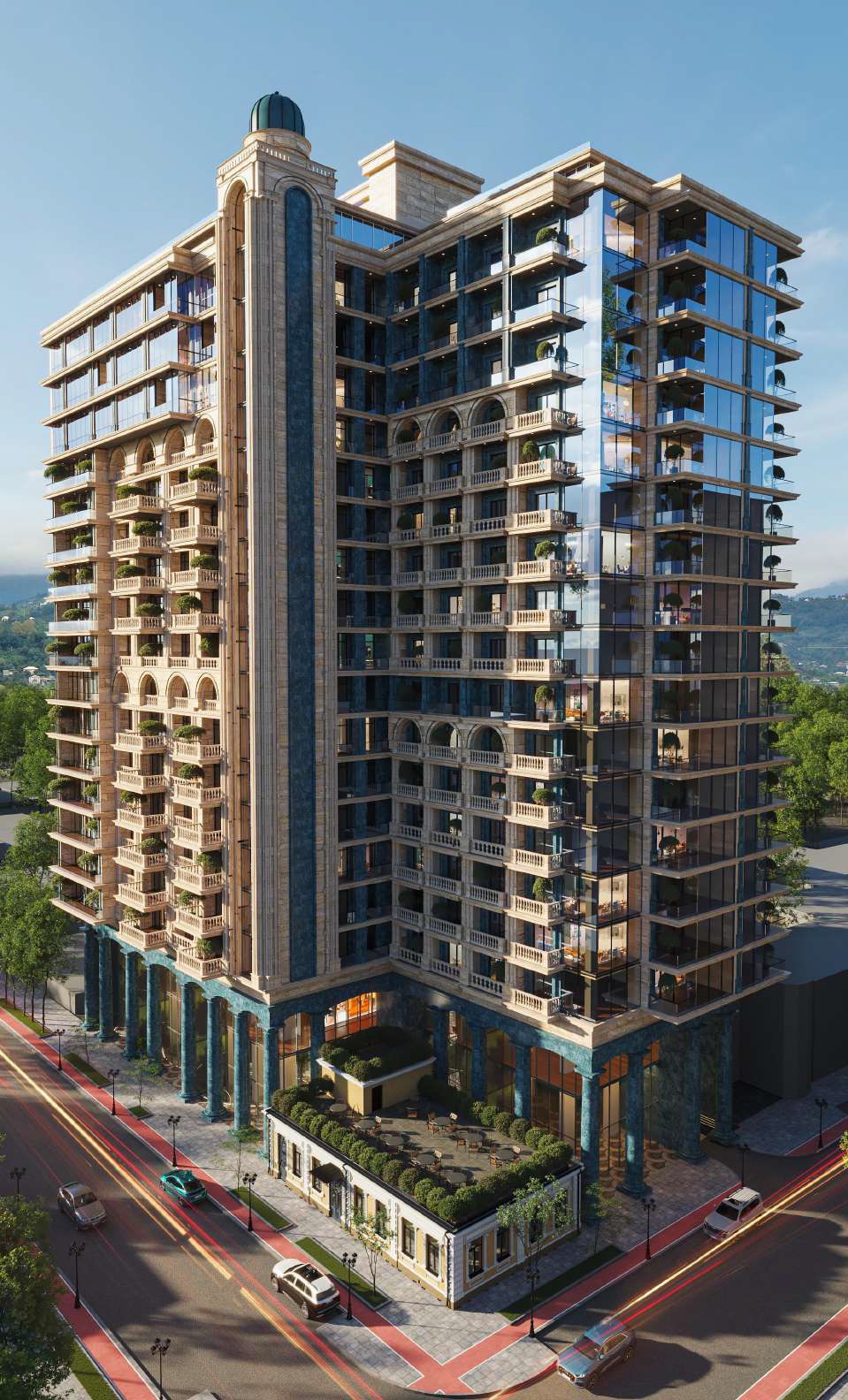 The new building is an exclusive premium residential complex built in the heart of historic Batumi and is located at the intersection of the city’s main streets, surrounded by green spaces, near Central Park, schools, kindergartens, universities and hospitals.